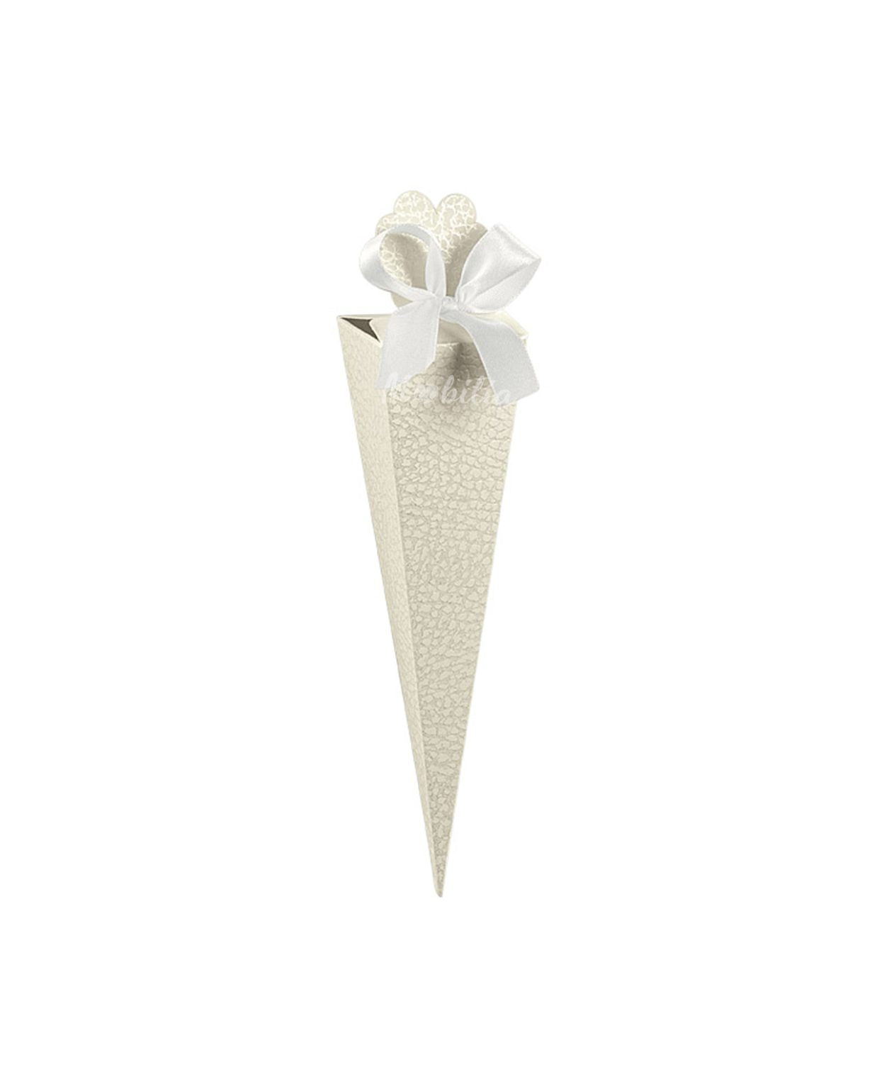 Scatole a forma di cono, realizzate in cartoncino effetto “pelle bianco” .