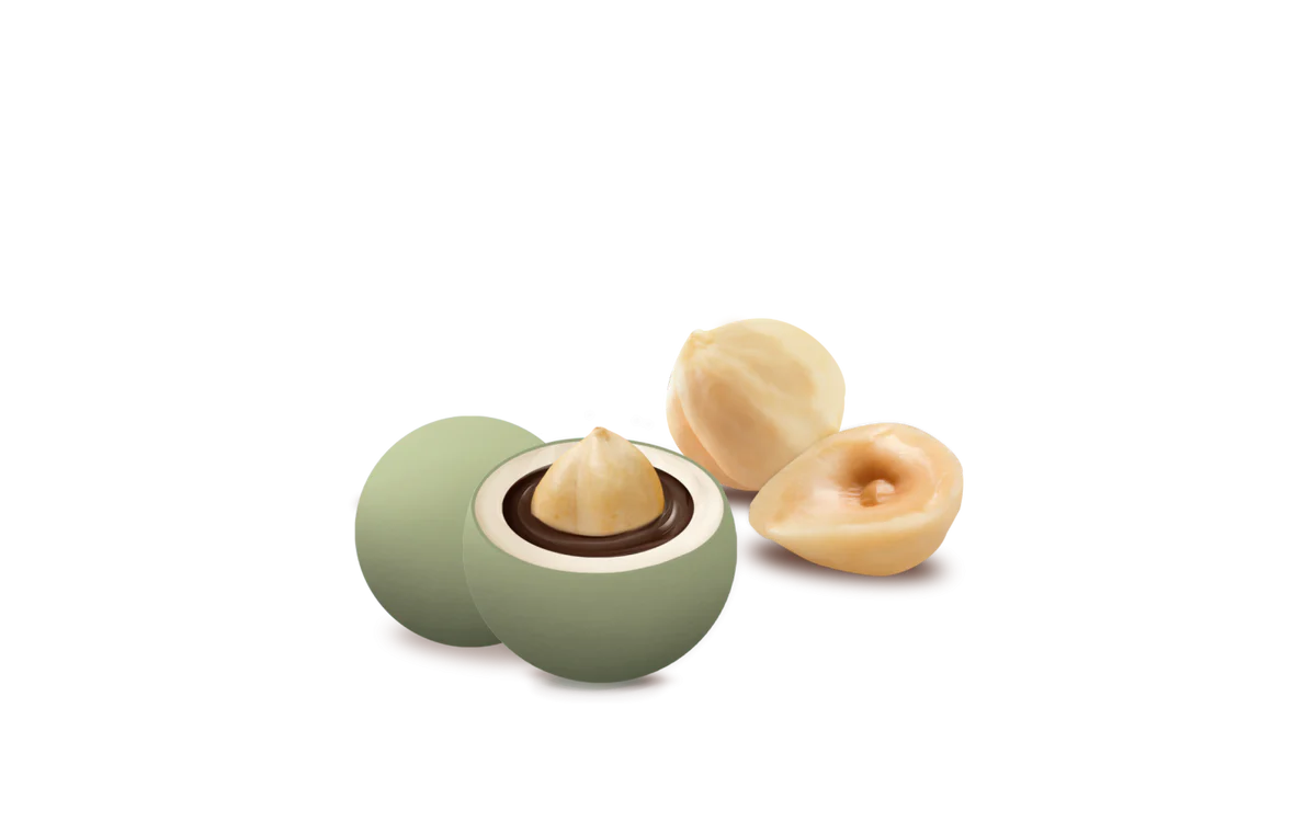Nocciola tostata ricoperta da cioccolato fondente e bianco e da un sottile strato di zucchero.