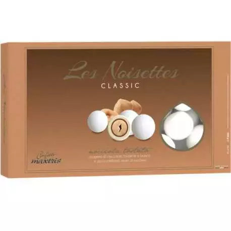 Maxtris Noisettes Bianco: confetti bianchi alla nocciola (Noisettes) tostata ricoperta di cioccolato fondente e bianco, le delizie tonde, le scatole da 1 Kg