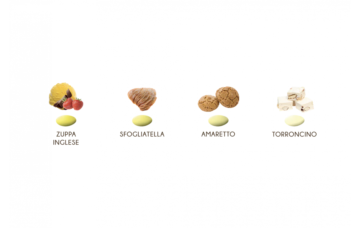 Mandorla tostata avvolta da uno strato di cioccolato bianco o al latte assortito nei gusti: zuppa inglese, sfogliatella, amaretto e torroncino ricoperto da un sottile strato di zucchero.