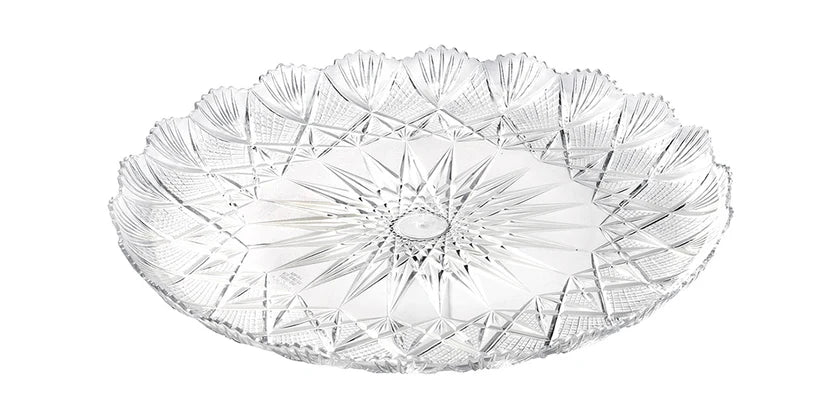Vassoio trasparente con decorazione ad incisione sul fondo e sul bordo, l'ideale per servire con classe dolci e semifreddi.